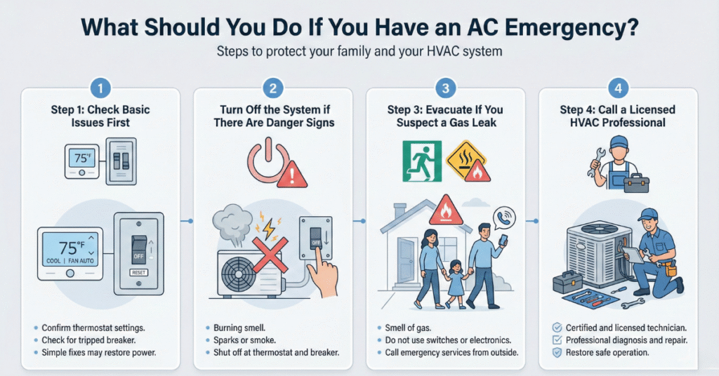An emergency AC repair is needed when your cooling system fails in a way that threatens health, safety, or could cause significant property damage. These situations require immediate professional attention, regardless of the time of day.