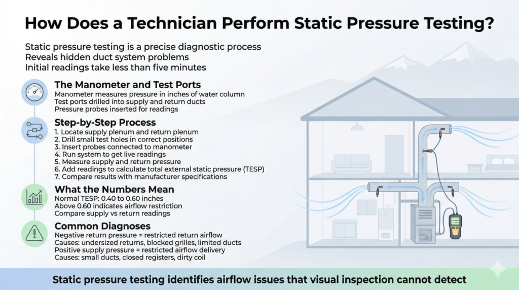 Static pressure testing is a precise diagnostic process that gives a technician a clear picture of what is happening inside your duct system. It takes less than five minutes to get the initial readings, but the interpretation of those readings can reveal problems that no visual inspection would ever catch.