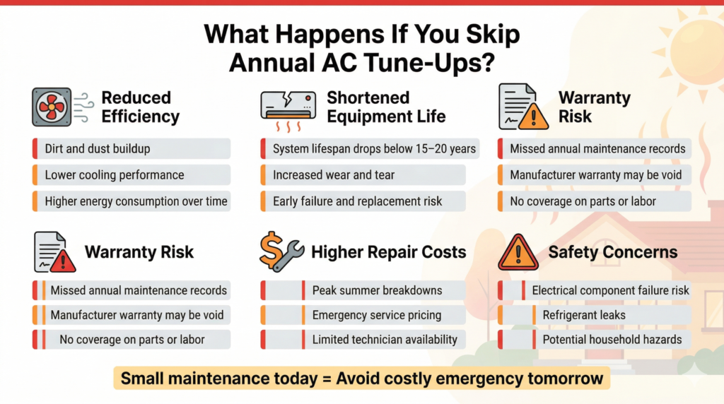 - Skipping annual tune-ups can void manufacturer warranties and increase the risk of costly mid-summer breakdowns